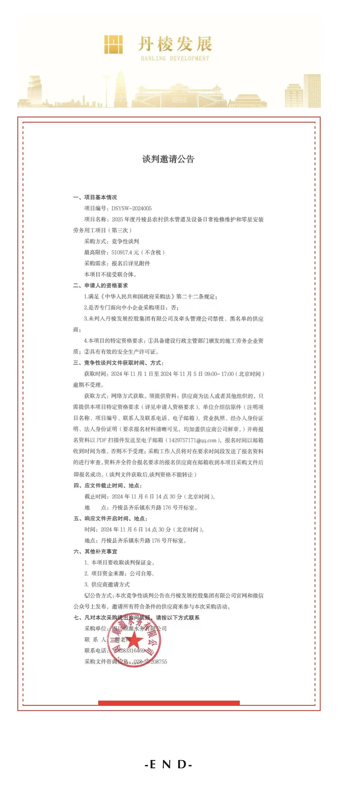 2025年度丹棱縣農(nóng)村供水管道及設備日常搶修維護和零星安裝勞務用工項目(第三次)談判邀請公告