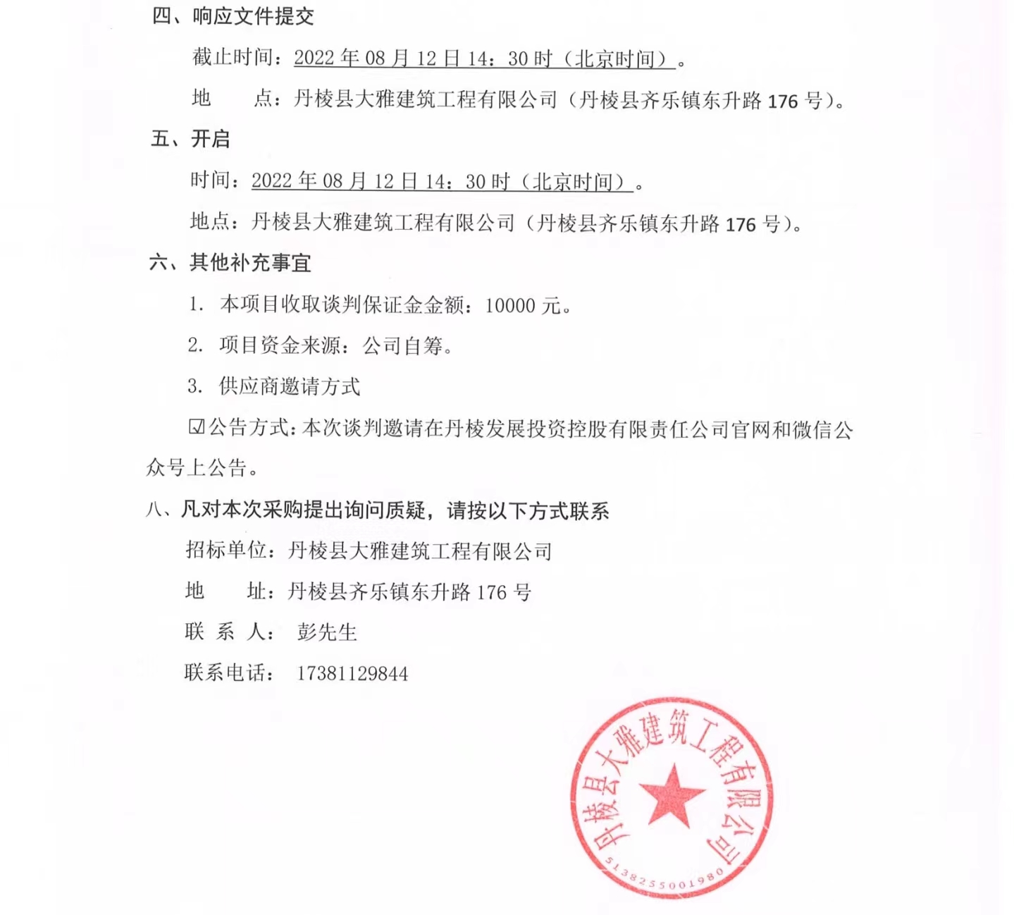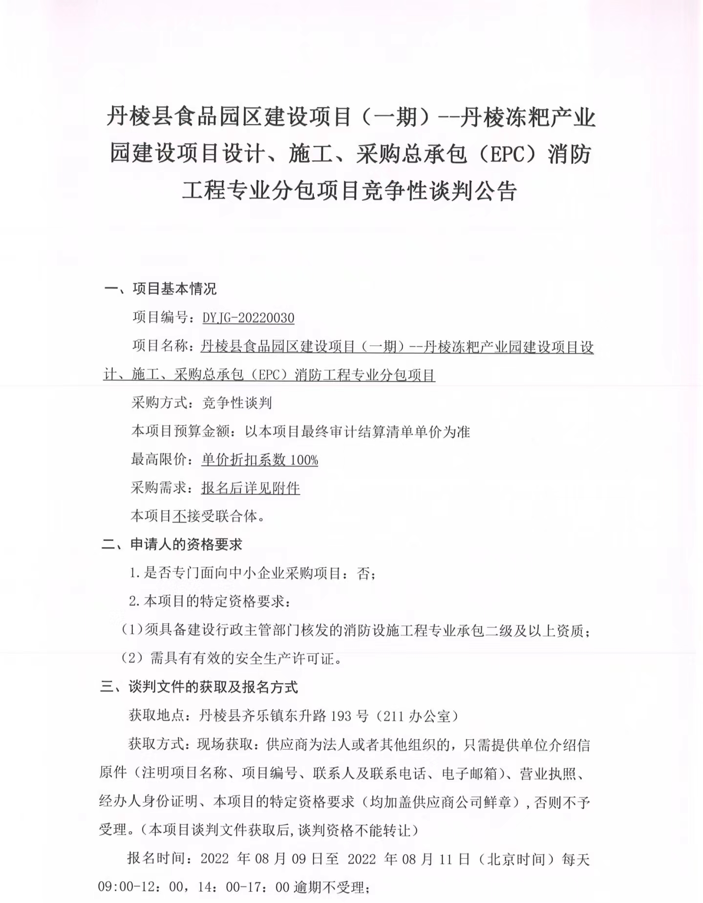 丹棱縣食品園區(qū)建設項目(一期)--丹棱凍粑產業(yè)園建設項目設計、施工、采購總承包(EPC)消防工程專業(yè)分包項目競爭性談判公告