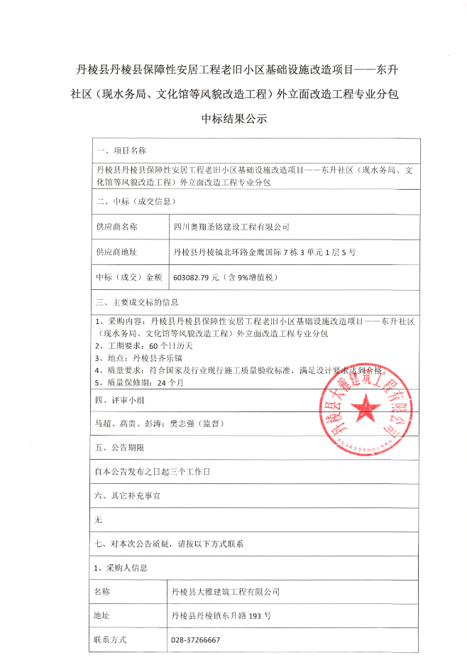 【大雅建筑公司】丹棱縣保障性安居工程老舊小區(qū)基礎設施改造項目--東升社區(qū)(現(xiàn)水務局、文化館等風貌改造工程)外立面改造工程專業(yè)分包中標結果公示