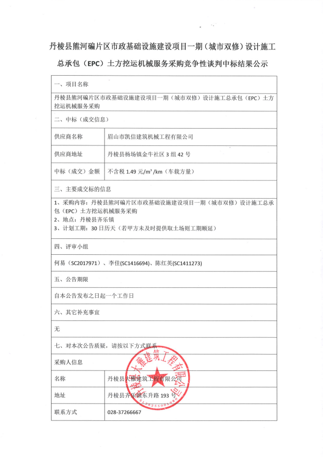 丹棱縣熊河碥片區(qū)市政基礎(chǔ)設(shè)施建設(shè)項(xiàng)目一期(城市雙修)設(shè)計(jì)施工 總承包(EPC)土方挖運(yùn)機(jī)械服務(wù)采購競爭性談判中標(biāo)結(jié)果公示