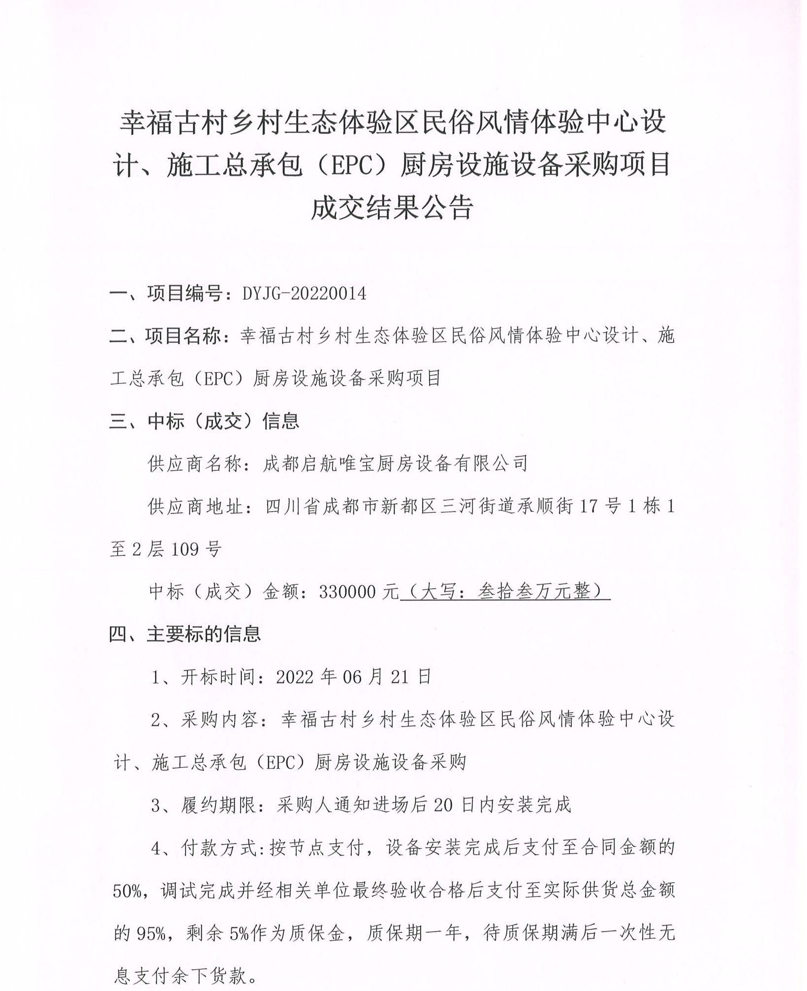 幸福古村鄉(xiāng)村生態(tài)體驗區(qū)民俗風情體驗中心設計、施工總承包(EPC)廚房設施設備采購項目成交結(jié)果公告