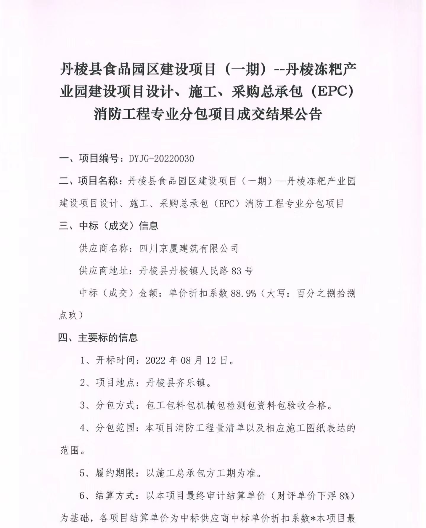 丹棱縣食品園區(qū)建設(shè)項(xiàng)目(一期)--丹棱凍粑產(chǎn)業(yè)園建設(shè)項(xiàng)目設(shè)計(jì)、施工、采購(gòu)總承包(EPC)消防工程專(zhuān)業(yè)分包項(xiàng)目成交結(jié)果公告