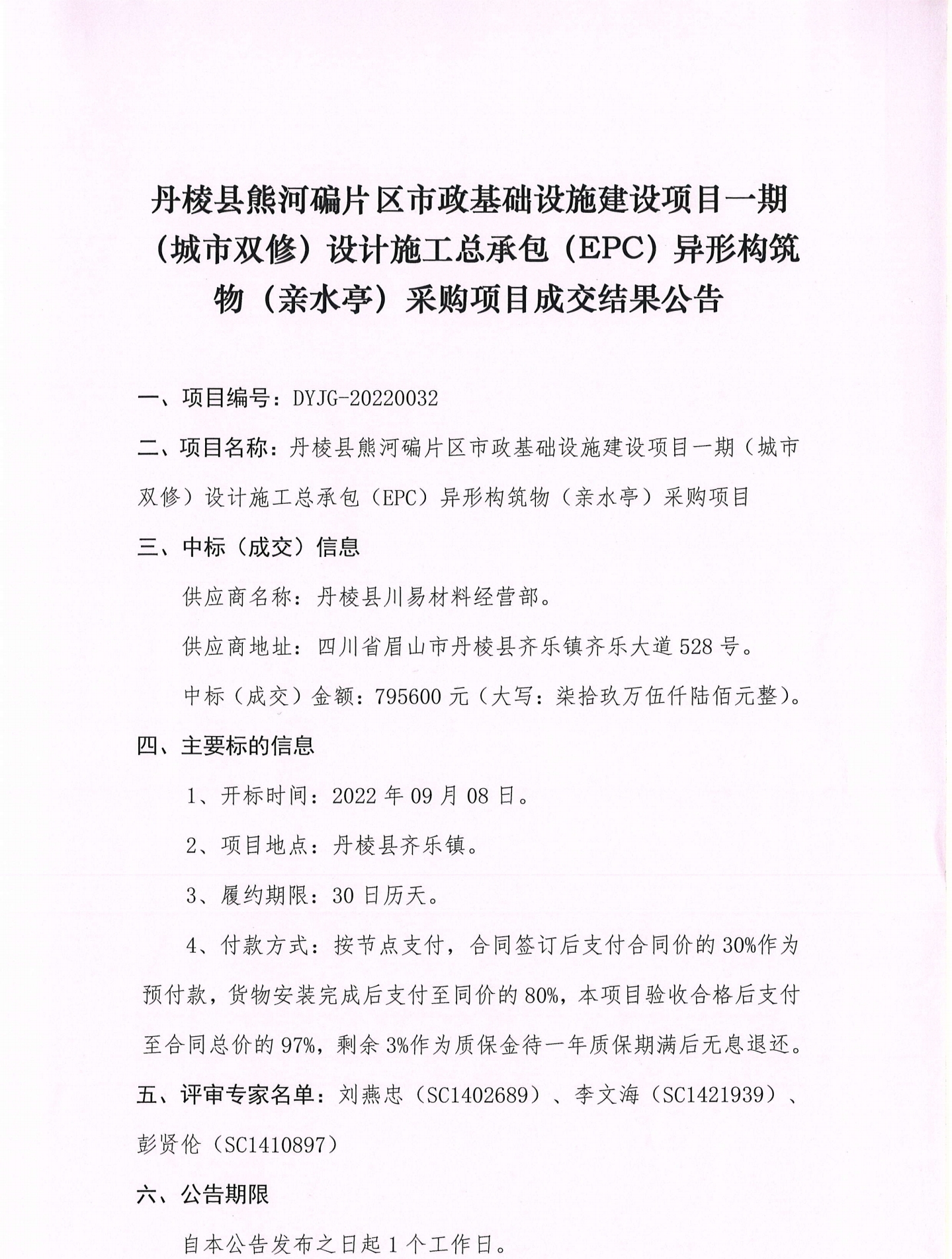 丹棱縣熊河碥片區(qū)市政基礎設施建設項目一期(城市雙修)設計施工總承包(EPC)異形構(gòu)筑物(親水亭)采購項目成交結(jié)果公告