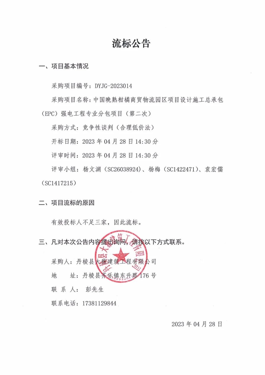 中國(guó)晚熟柑橘商貿(mào)物流園區(qū)項(xiàng)目設(shè)計(jì)施工總承包(EPC)強(qiáng)電工程專業(yè)分包項(xiàng)目(第二次)流標(biāo)公告