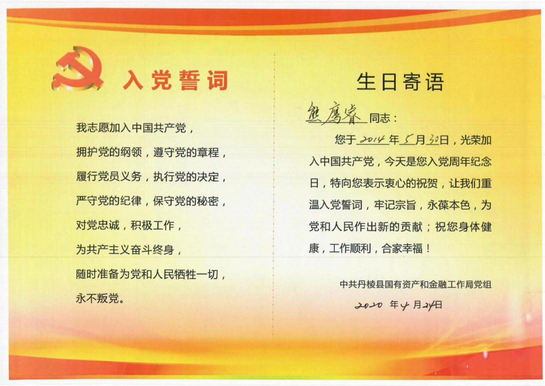 工作安排后,縣國(guó)資金融局黨組集體為5月入黨黨員過政治生日,縣國(guó)資金融局(縣金融服務(wù)中心)副主任茍永慶同志過生日的黨員們送上精心制作的“黨員政治生日卡”,勉勵(lì)黨員同志要“常思入黨初衷、銘記入黨誓詞、牢記黨員義務(wù)”,發(fā)揮黨員先鋒模范作用,在今后的工作中不斷創(chuàng)先爭(zhēng)優(yōu),做好表率。活動(dòng)最后,全體黨員同志在縣國(guó)資金融局黨組成員、副局長(zhǎng)潘國(guó)榮同志的帶領(lǐng)下重溫入黨誓詞、面對(duì)黨旗莊嚴(yán)宣誓。